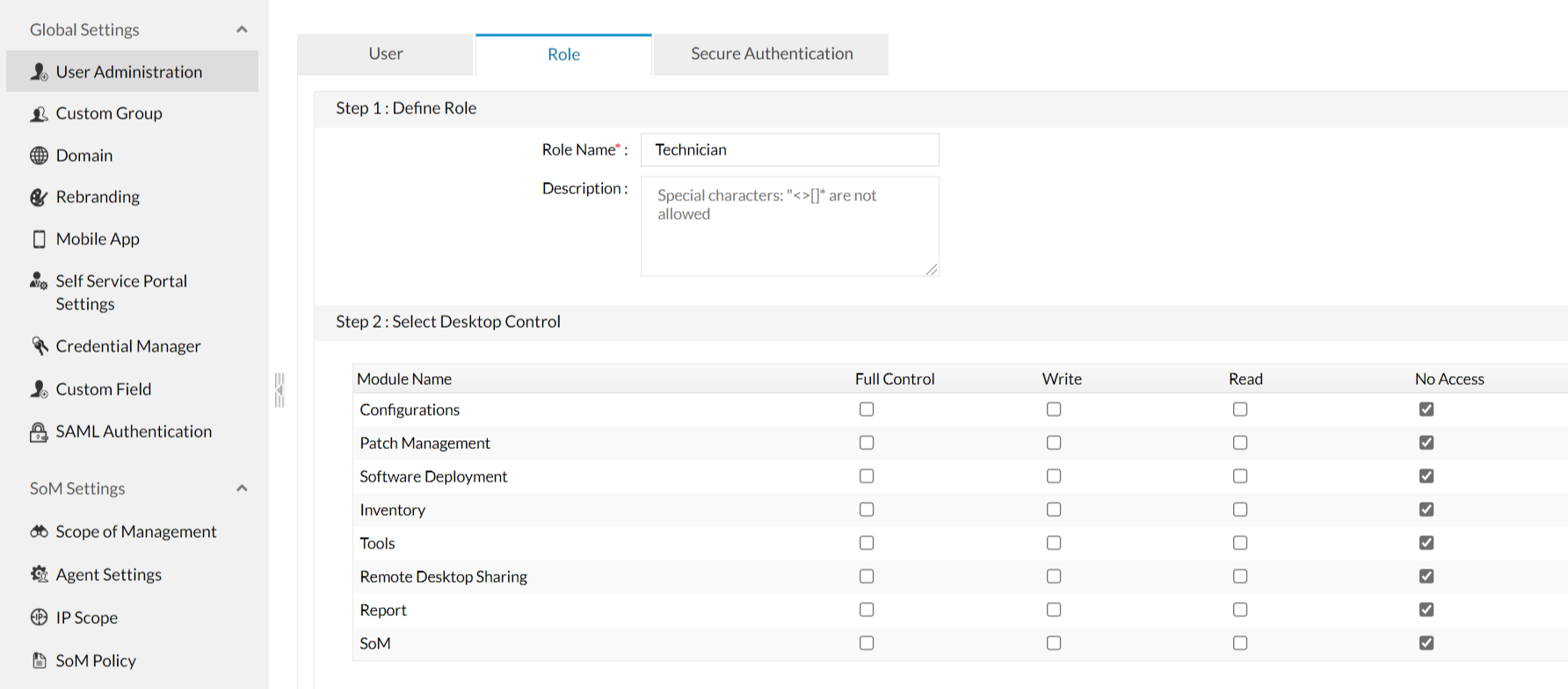 - Technician - The Technician Role has a well-defined set of permissions to perform specific operations. Users under the Technician role are restricted from performing all the operations listed under the Admin tab.