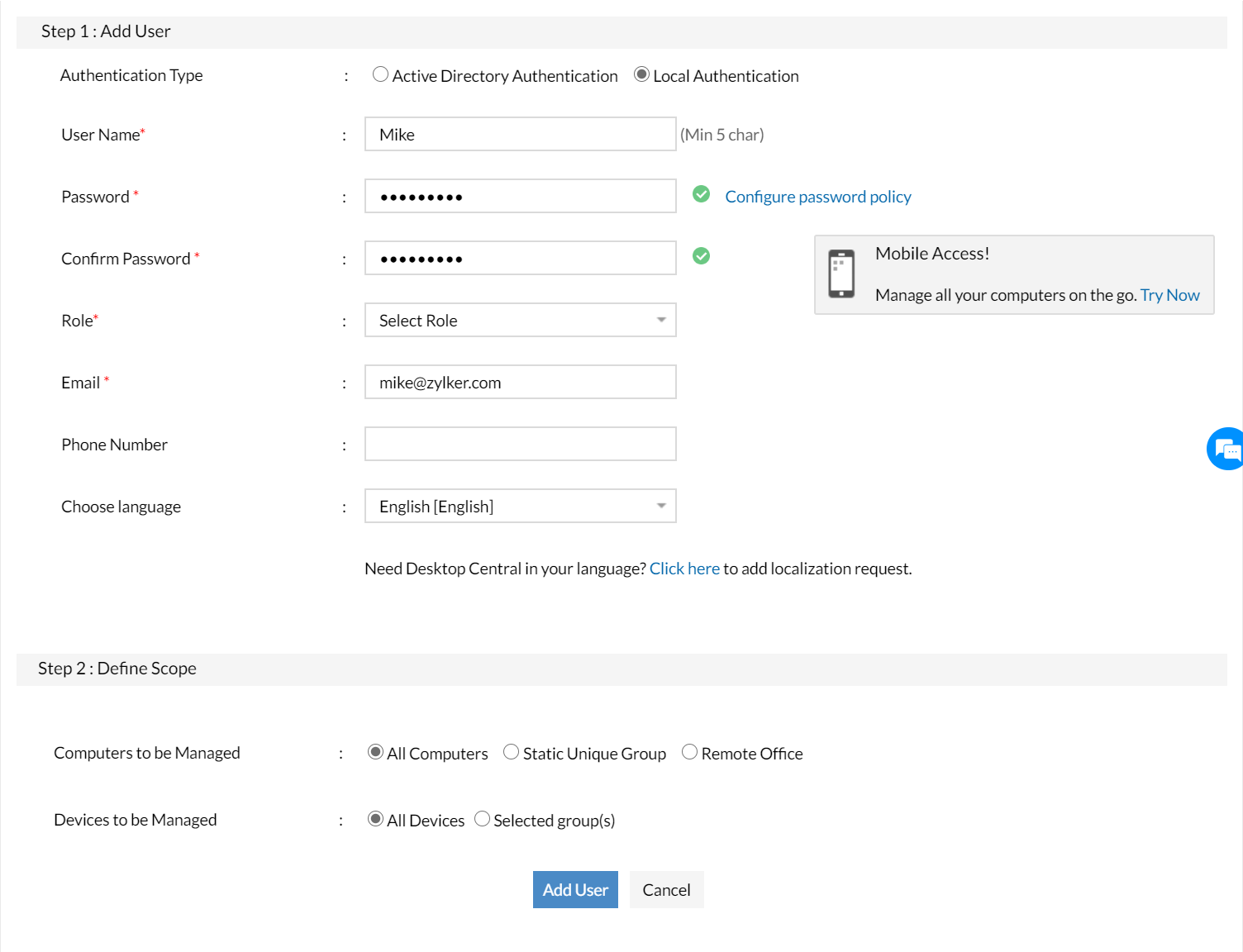 After defining the user's role, you can choose the target computers that will be mapped to every user. Therefore, a particular user with an assigned role will be able to perform the prescribed activities associated with that role, on the set of target computers mapped to the user. By limiting the user's permission to specific set of computers, the user possesses enough permission to perform his role but will not be able to take unduly advantage. The target that you define as the scope for the user, can be static unique groups, remote offices or all computers.