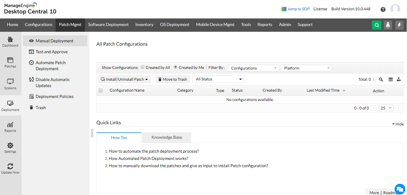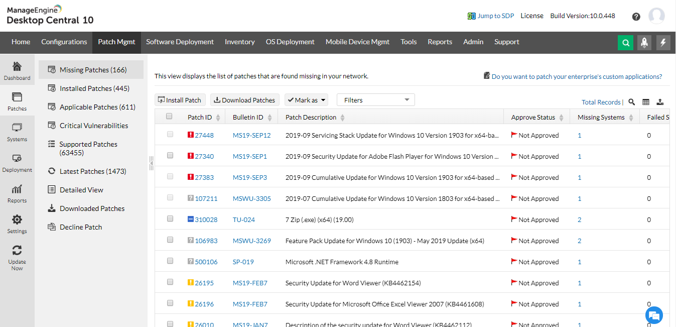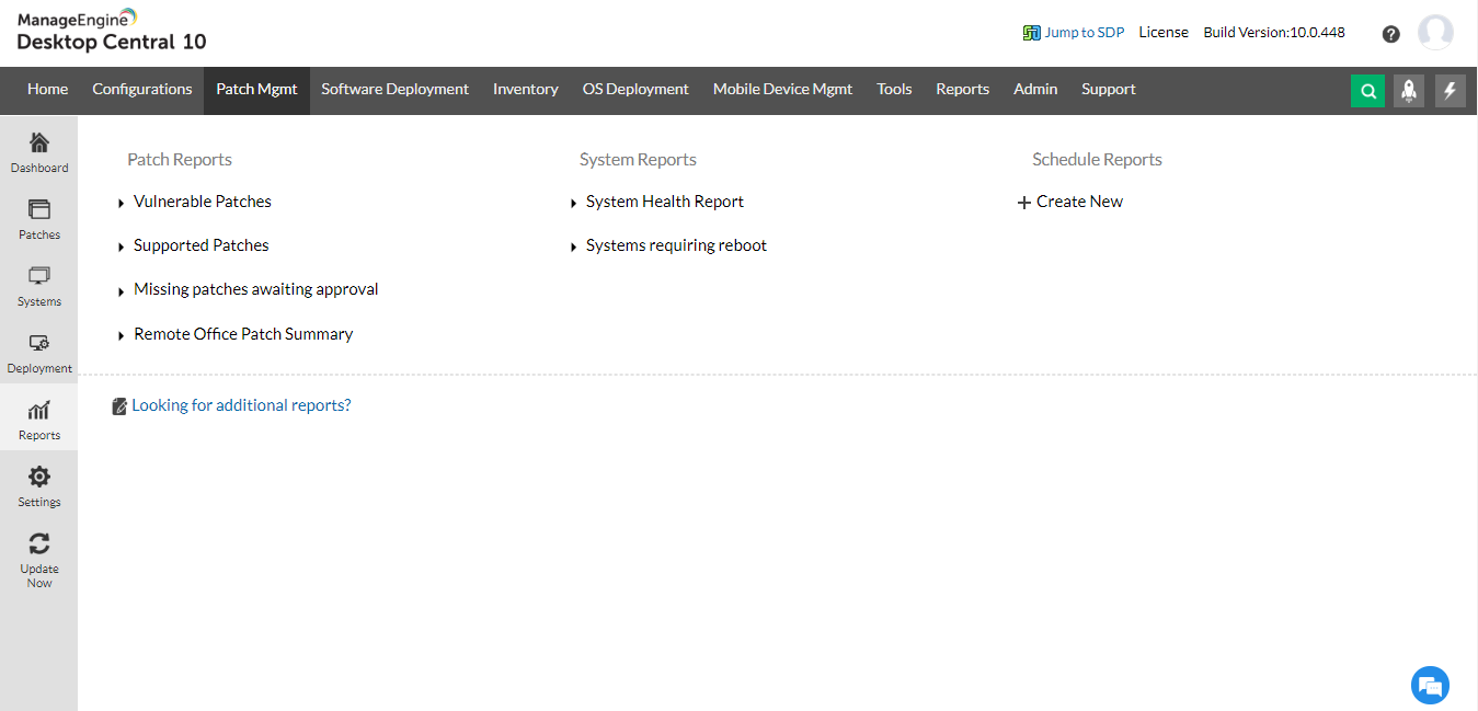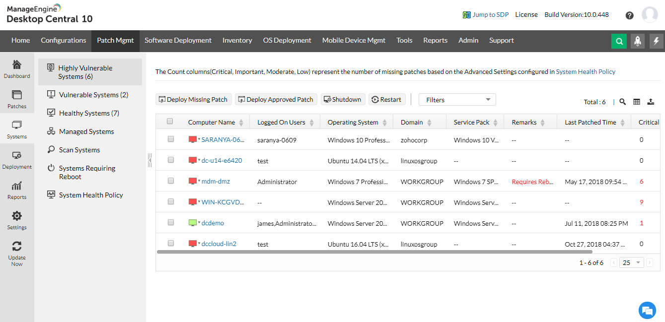 Patch management dashboard that gives you insights on your network in one go Patch-based view System based view: Allows you to identify Healthy, Vulnerable and highly vulnerable systems at a glance Deploy patches manually or schedule the deployment at off hours Deployment policies that give you granular control over patch deployment Test and approve patches before deployment: manually or automatically Set it and forget it: Automate the complete patch management lifecycle with comprehensive customization optionsNumerous pre-defined pach reports that can be scheduled, shared or downloaded easily