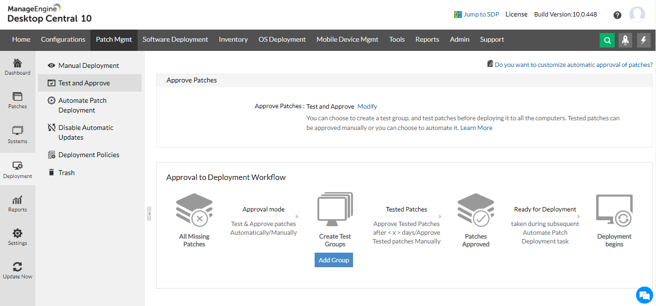 Most often the patches are deployed in a test environment before they are rolled out to the entire network. This makes the deployment error free and stable.When you have a team of system administrators, you can ensure that the patches tested by the team is directly approved for deployment, providing admins more time for other critical tasks.